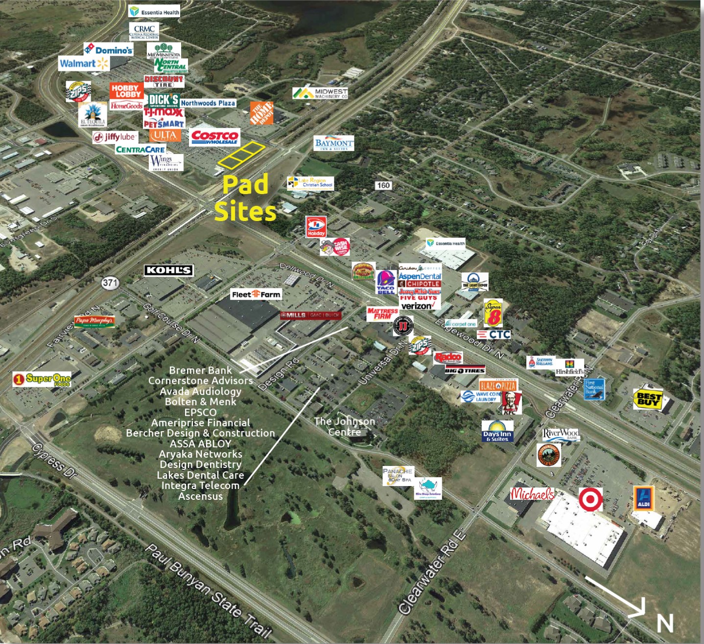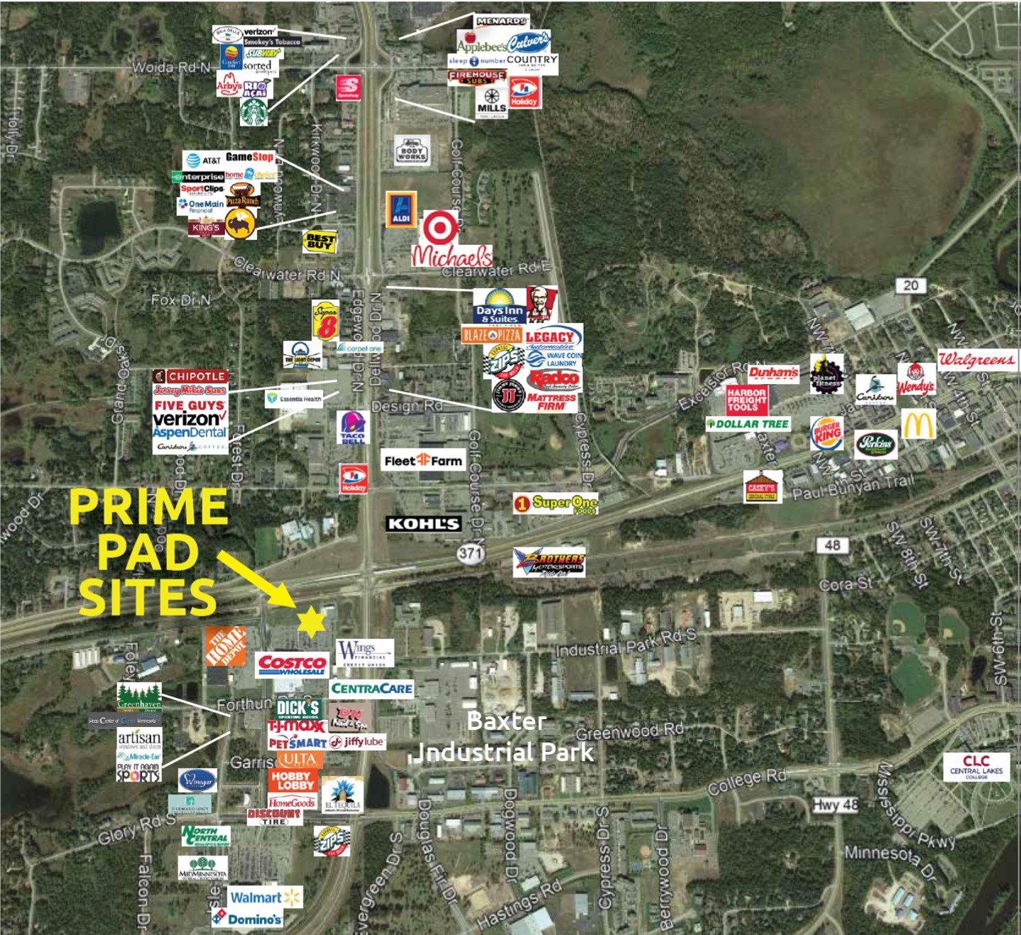 - Neighboring Businesses: Lots are located in front of Costco. Others nearby include CentraCare Health Systems, Wings Financial, DN Nails, Jiffy Lube, Home Depot, Dick’s Sporting Goods, TJ Maxx, PetSmart, Ulta Beauty, Home Goods Hobby Lobby, El Tequila, Walmart, Zips, Discount Tire, Northwoods Plaza, Riverstone Center, MidMN Fed CU, North Medical Supply, Crosby Regional Medical Center, Minneapolis Heart, Essentia Baxter Clinic, Surgery Center, Nystrom & Associates, Kohls, Fleet Farm, Cub Foods, plus numerous others.