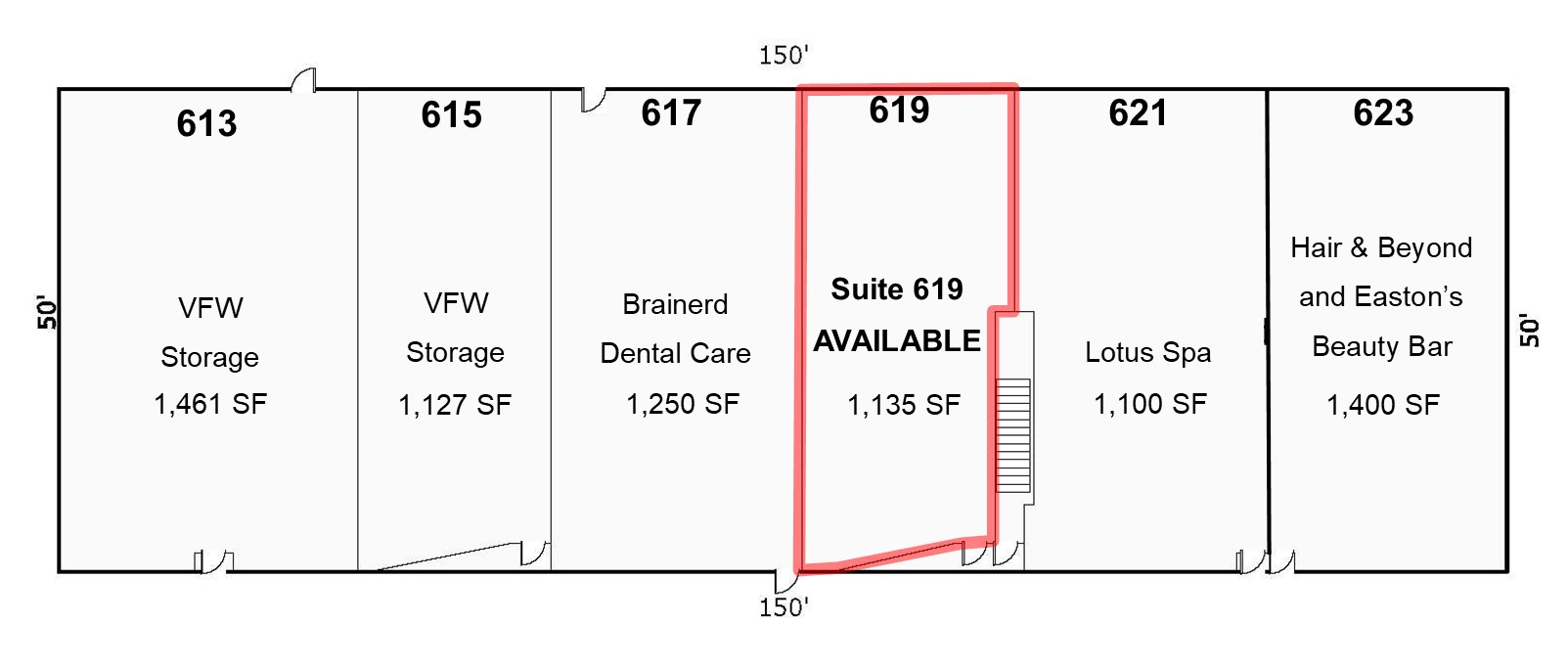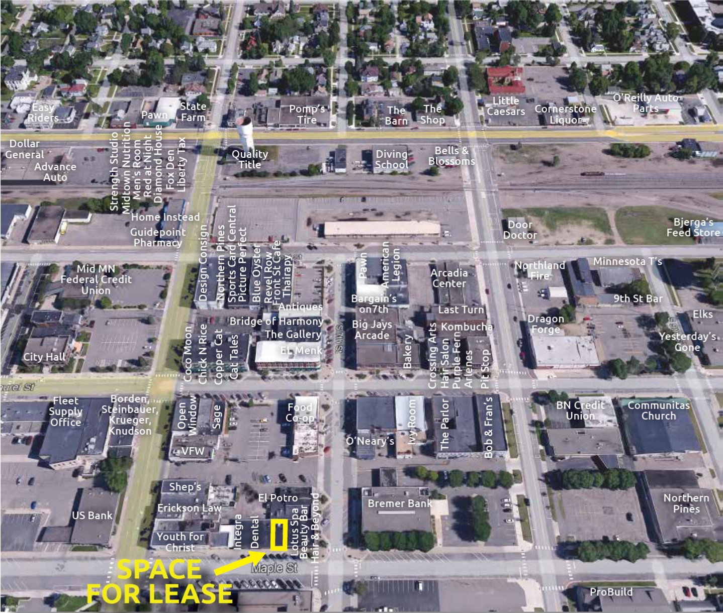 - Adjacent Tenants: Hair & Beyond, Easton’s Beauty Bar, Lotus Spa, Brainerd Dental Care, and VFW Storage