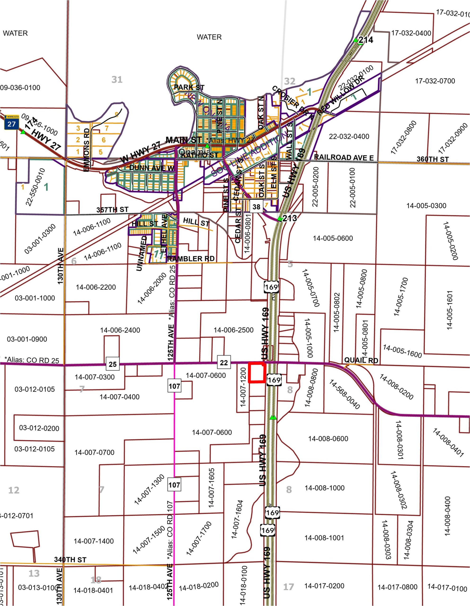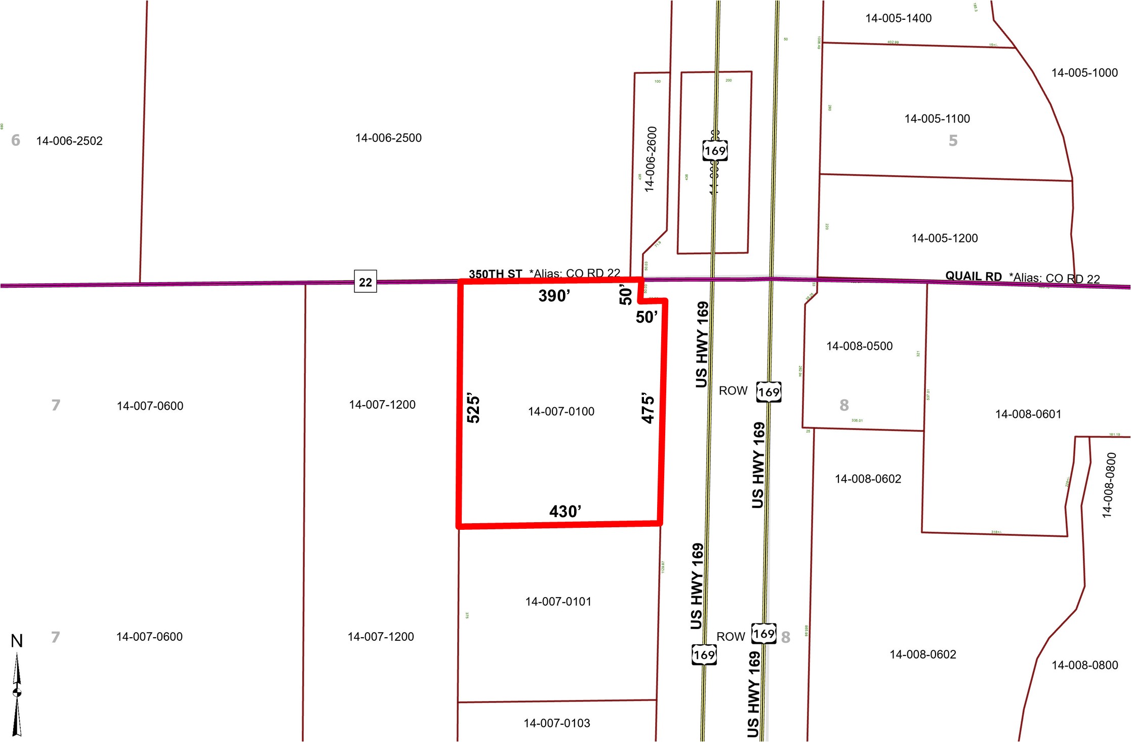 - Road Frontage: 475’ on Hwy 169 and Approx. 390’ on 350th Street (CR 22)