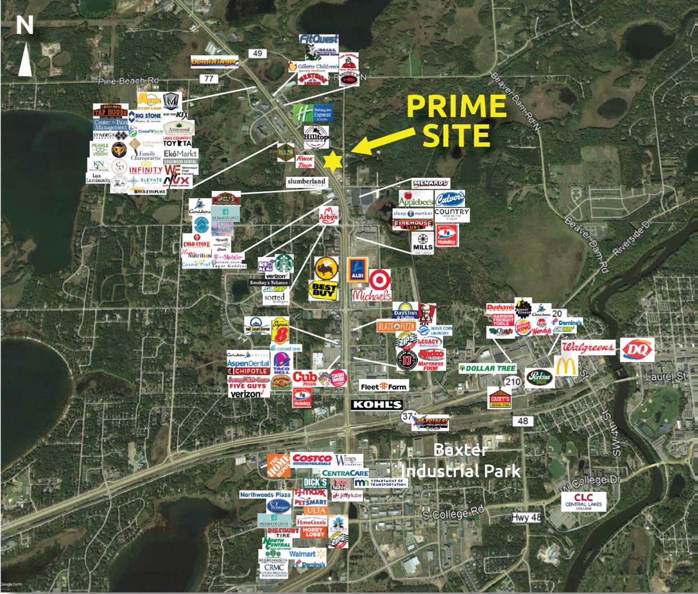 • Neighboring Businesses: Located near Lakes Audio, Hilltop Trailers, Brainerd General Rental, HART, Applebee’s, Culver’s, Menards, Arby’s, Subway, Starbucks, Grizzly’s Retail Center, Slumberland, Baxter Village, Holiday Inn Express, Arrowwood Lodge, Jack Pine Brewery, Kwik Trip, West Side Liquor, plus numerous others.