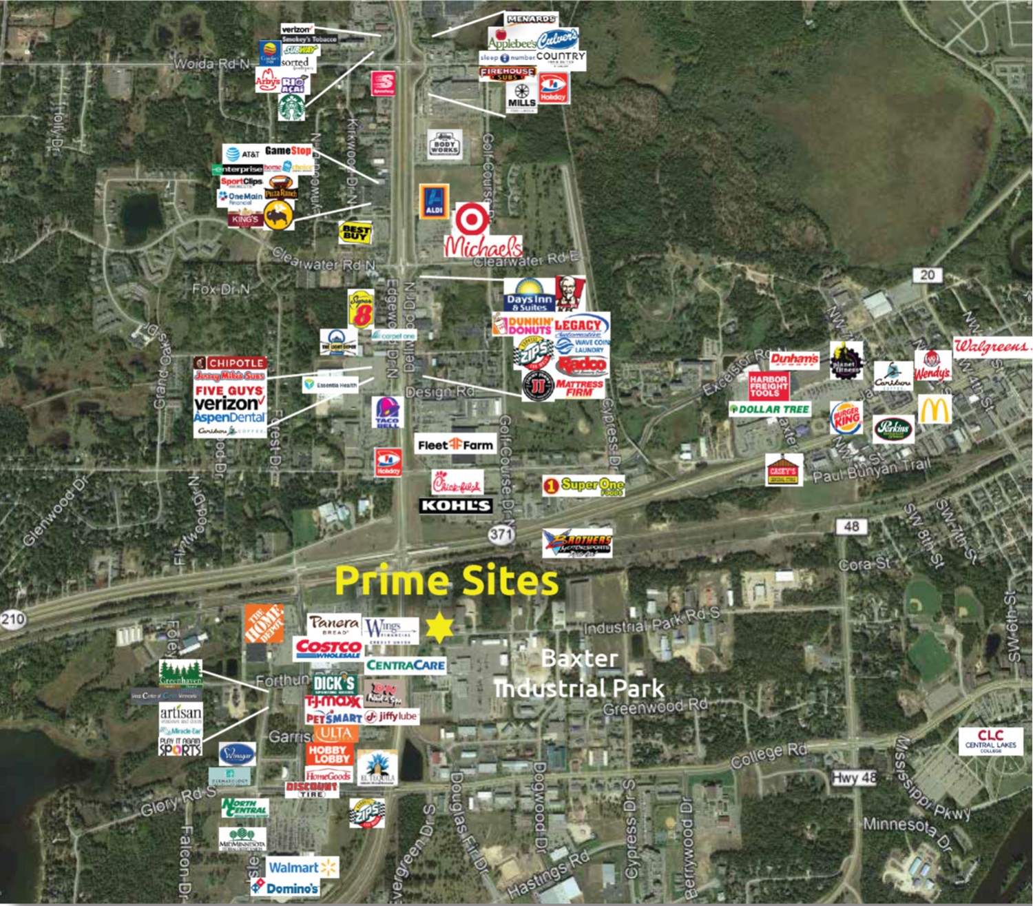 - Neighboring Businesses: Located in the Baxter Industrial Park, nearby businesses include Widseth, Viking Distribution, MNDOT, Costco, CentraCare Health Systems, Wings Financial, DN Nails, Jiffy Lube, Home Depot, Dick’s Sporting Goods, TJ Maxx, PetSmart, Ulta Beauty, El Tequila, Walmart, Discount Tire, Northwoods Plaza, Riverstone Center, MidMN Fed CU, Crosby Regional Medical Center, Minneapolis Heart, Essentia Baxter Clinic, Surgery Center, Nystrom, Kohls, Fleet Farm, Cub Foods, plus numerous others.
