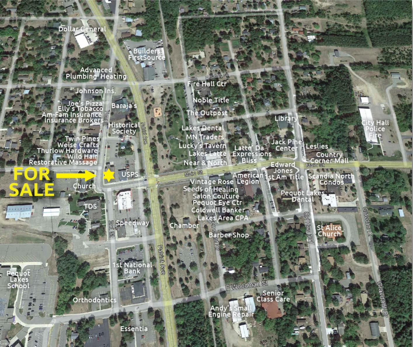 - Directions: From the stoplight intersection in Pequot Lakes (Patriot Ave & Main Street) - West on Main Street 1 block - property is the North at the corner of Main Street and Front Street