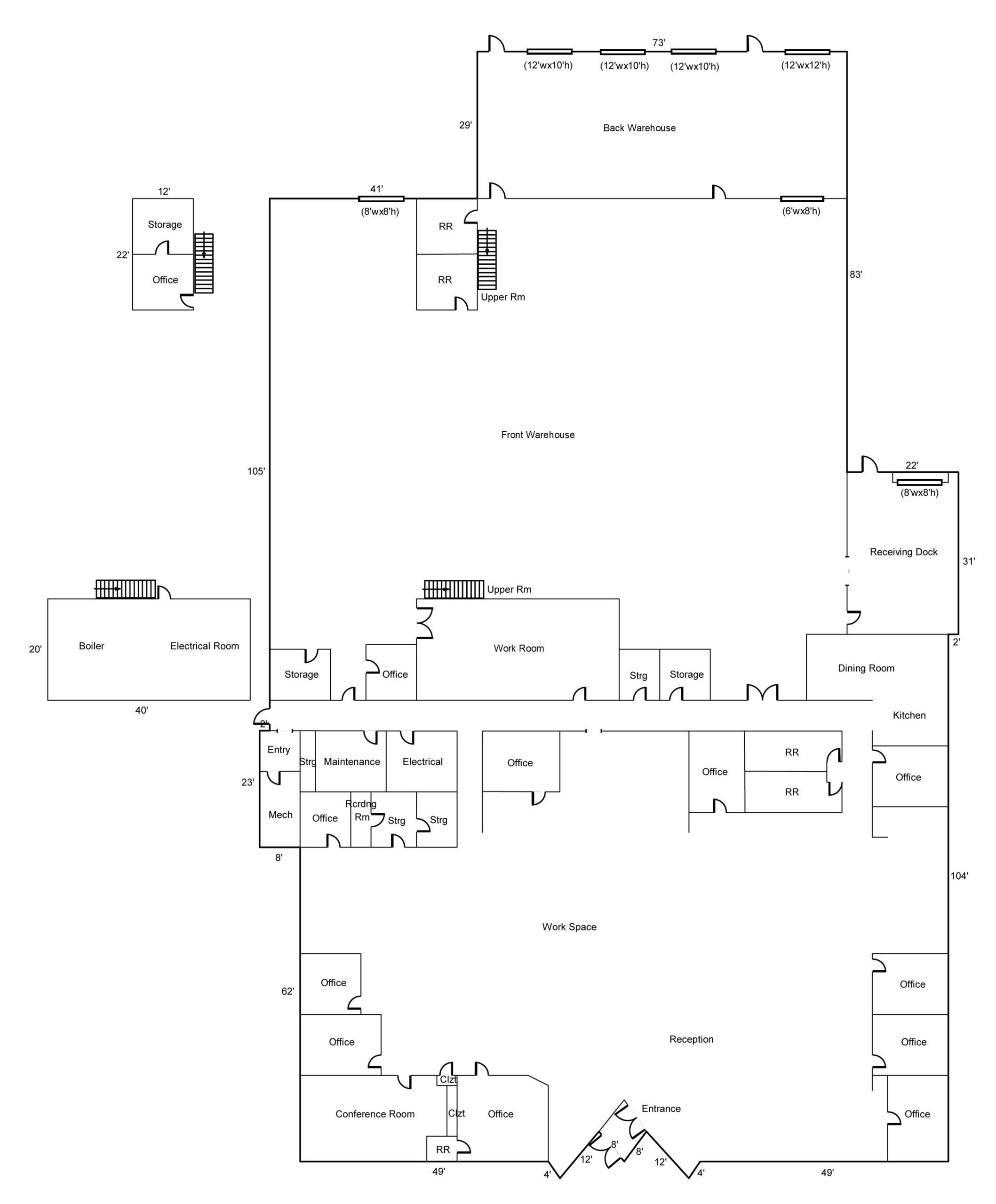 - Overhead Doors: 1 (12’H x 12’W) Back Warehouse; 3 (12’H x 10’W) Back Warehouse; 1 (8’H x 8’W) Front Warehouse; 1 (6’W x 8’H) Interior between Warehouses